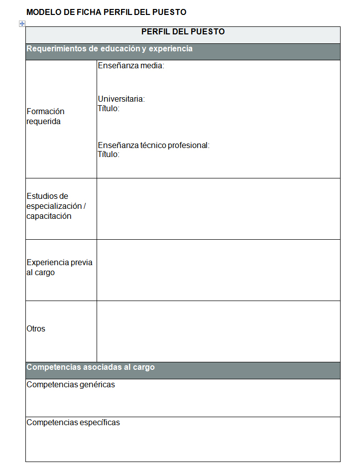 Las fichas de descripción de perfiles de los puestos de trabajo contienen información vinculada a la formación y a las características intelectuales, emocionales y sociales necesarias para el desarrollo del cargo. Cada una de las características debe considerarse como la información básica según la cual se realizará la evaluación de las y los aspirantes, por lo cual resulta muy importante generar un perfil adecuado ya que esto implicará que se considere idóneo o no a una persona para ocupar un puesto de trabajo.